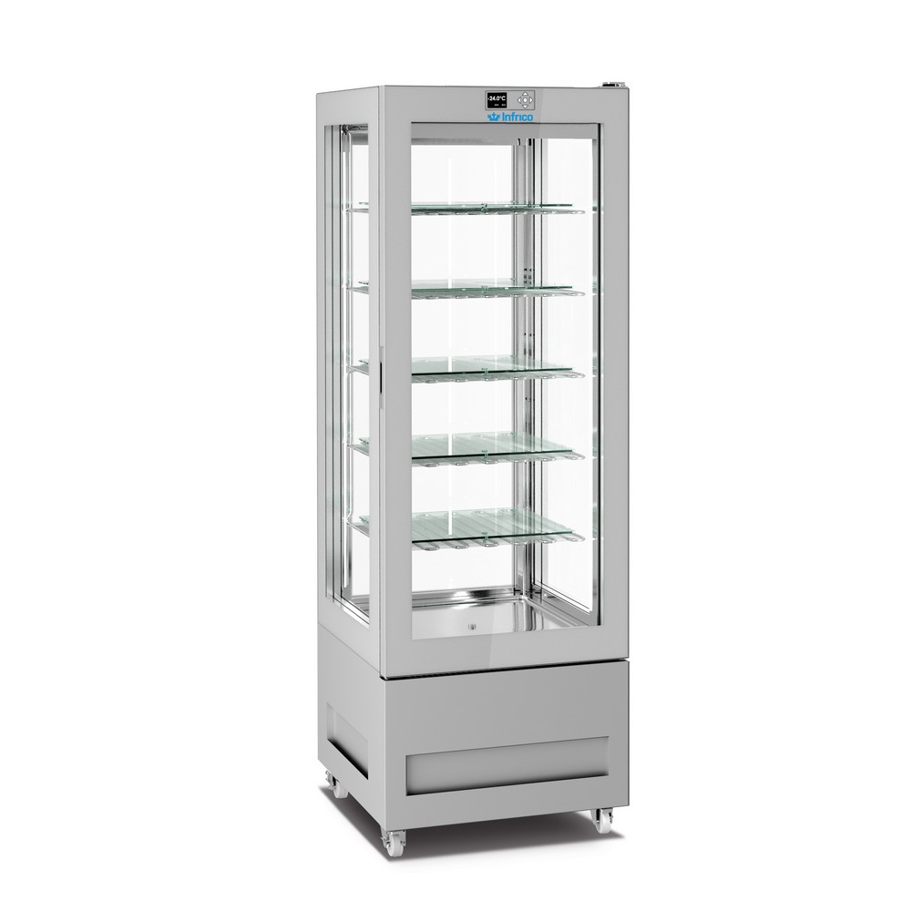 Gama de armarios expositores en cuatro caras de cristal, disponible en tres versiones: Heladería, Pastelería y No-Frost (Heladería-Pastelería)
